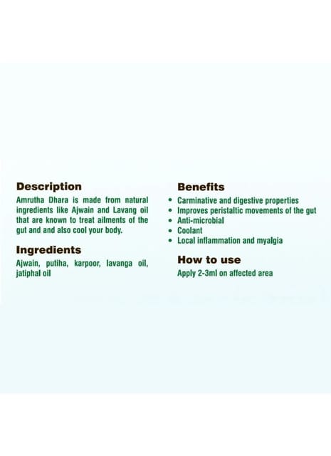 Amruth Dhara is an Ayurvedic herbal medicine that is traditionally used to treat a range of health conditions. This herbal medicine is made from a combination of natural ingredients that have been used in Ayurvedic medicine for their various health benefits. Amruth Dhara is a natural and effective way to support various aspects of health. This herbal medicine is made from natural ingredients and can be used alone or in conjunction with other health management strategies.