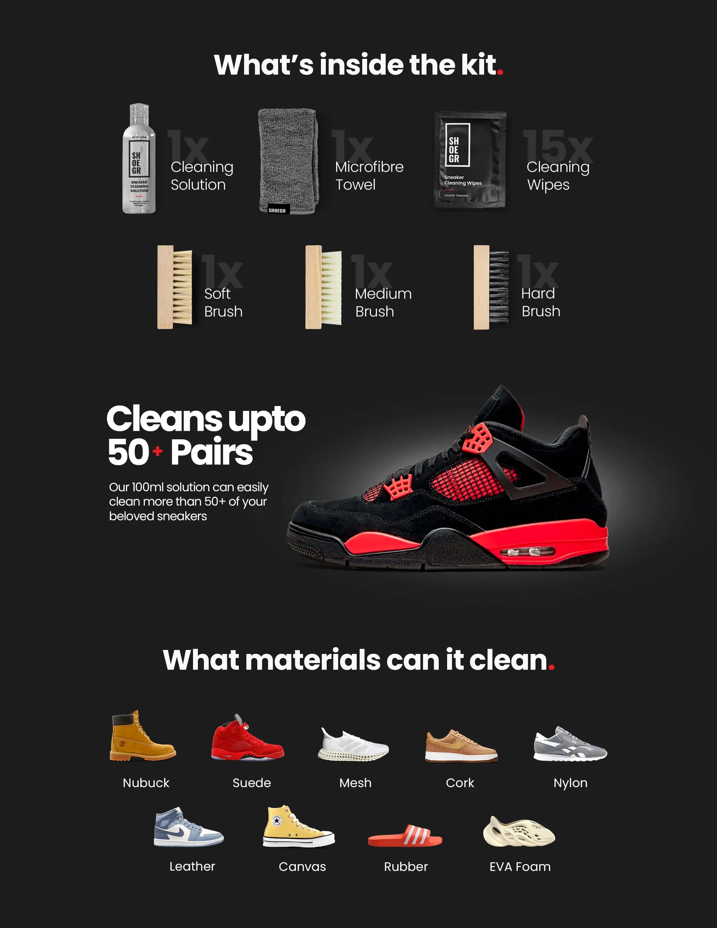 SHOEGR products are indigenous and specially formulated to endure the Indian streets. It doesn't matter if it's a regular Indian summer, monsoon, autumn, or winter. This product is suitable and safe to use for various shoe materials such as Nubuck, Canvas, Knit, Multi-Material & Suede. The Ultimate Sneaker Cleaning Kit has been tested on them all. It eliminates stains and restores the shoes' original colour.